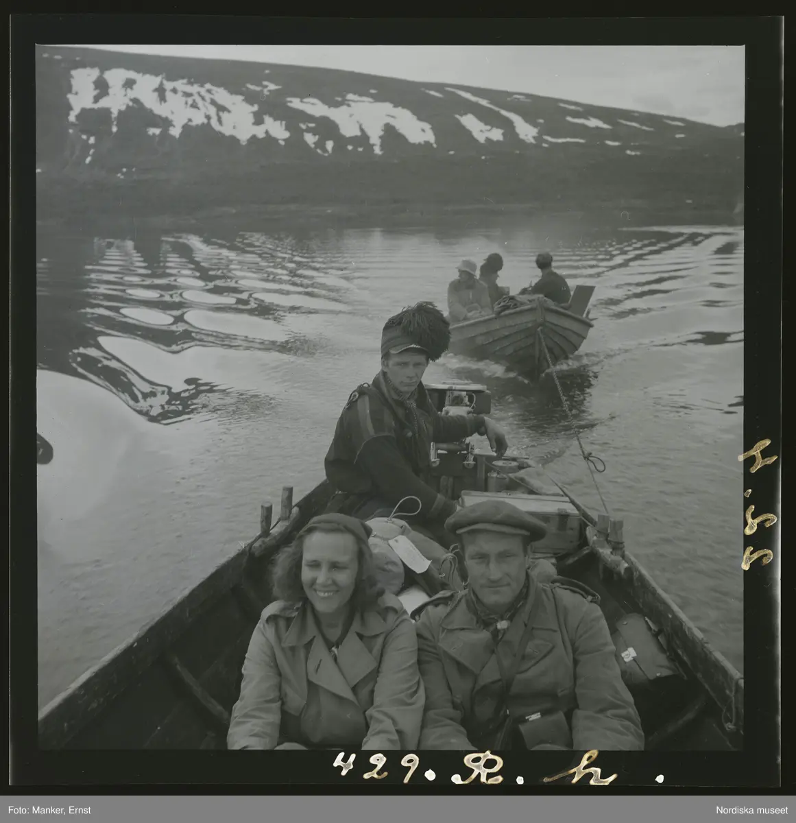 Titel: Paulus Utsi kör expeditionen över Akkajaure, Vaisaluokta i Jokkmokks socken, Lappland. Två båtar med passagerare på vattnet, i bakgrunden ses Pålnotjåkko och Akka.