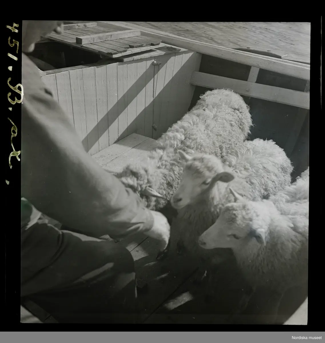 Fåren hämtas ombord i jullen för att föras över till Kongsö.