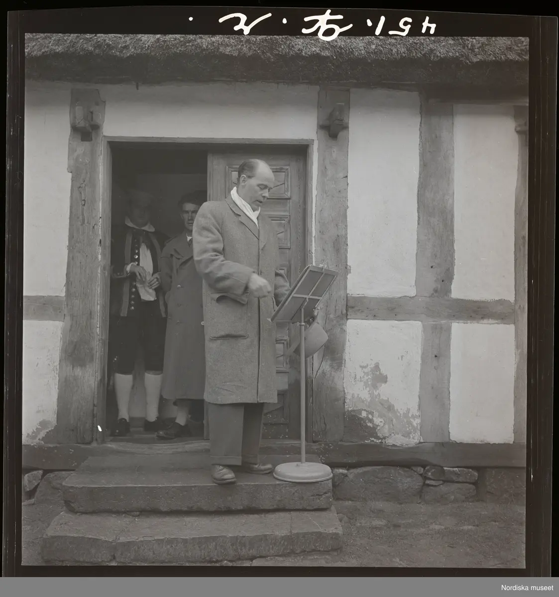 En man, ståendes på trappstegen in till ett hus, håller ett tal. Skansen, Stockholm.