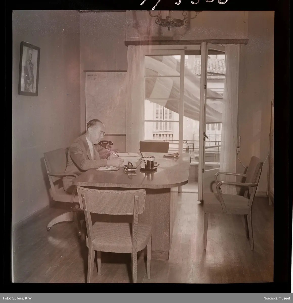 1717 I Svenska konsulatet Aten. En man arbetar vid ett skrivbord på Svenska konsulatet i Aten. Svenska flaggan syns utanför fönstret.