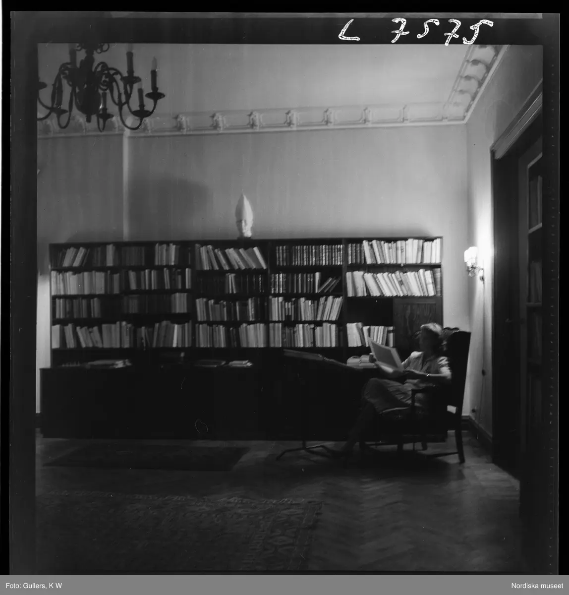 513 D Spooners Hemma hos redaktör Karlströmer. Kvinna sitter och läser framför hemmets bokhylla.