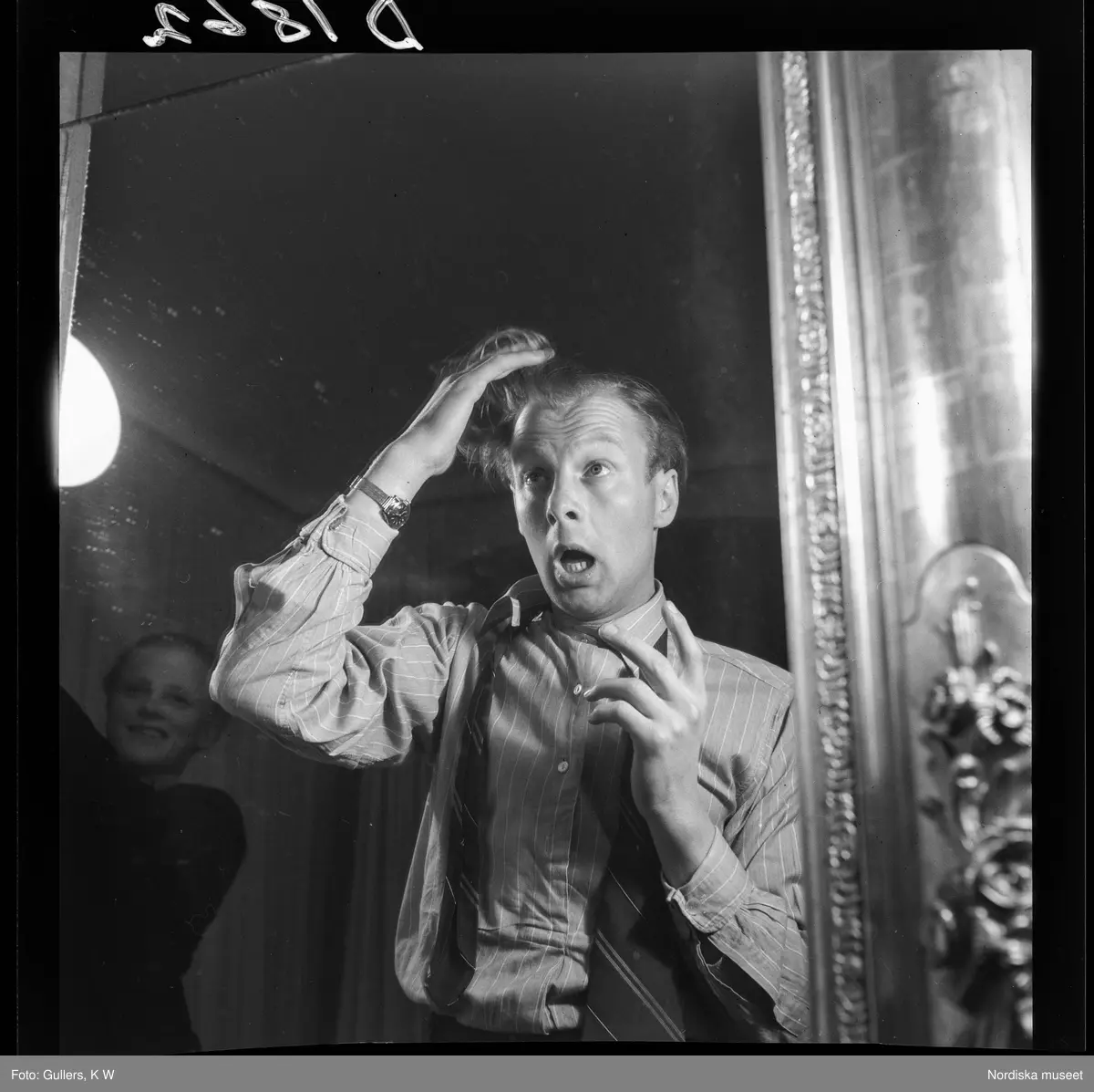 514 Medicinska sanningar för Allers. En man står framför en spegel och studerar förskräckt sitt hår.