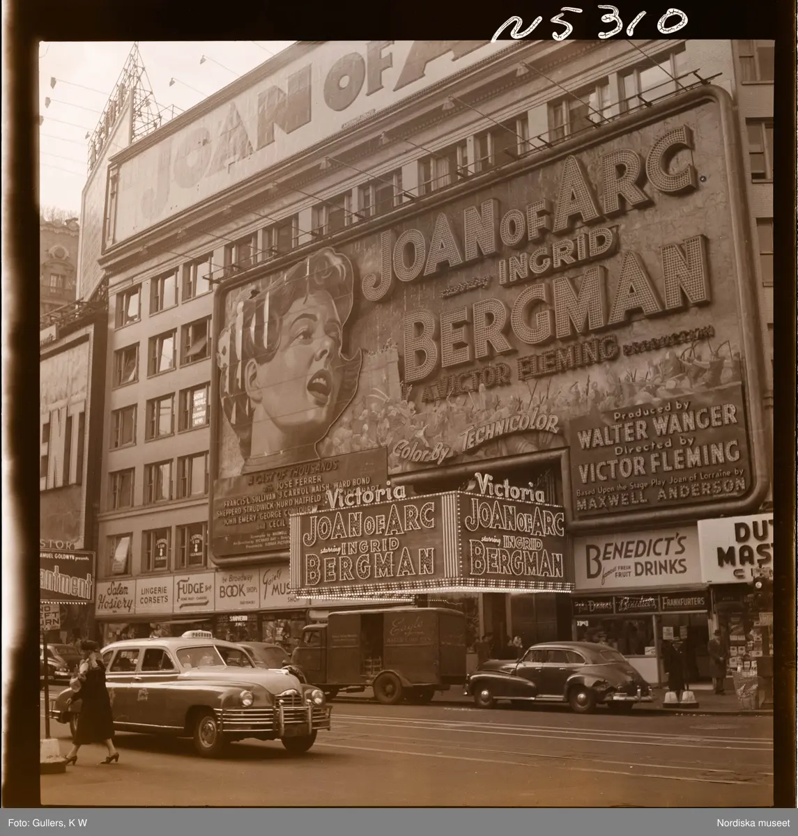 1690 New York allmänt (N.Y. Herald Tribune). Reklam/ annonsering på fasad för filmen "Joan of Arc" med Ingrid Bergman i huvudrollen.