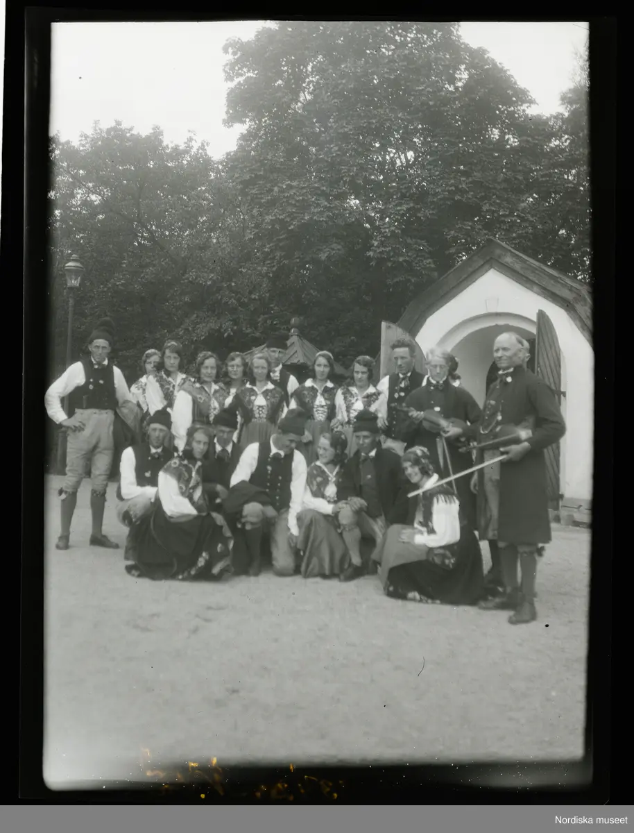 Män och kvinnor i folkdräkt uppställda för ett grupporträtt. Skansen, Stockholm.