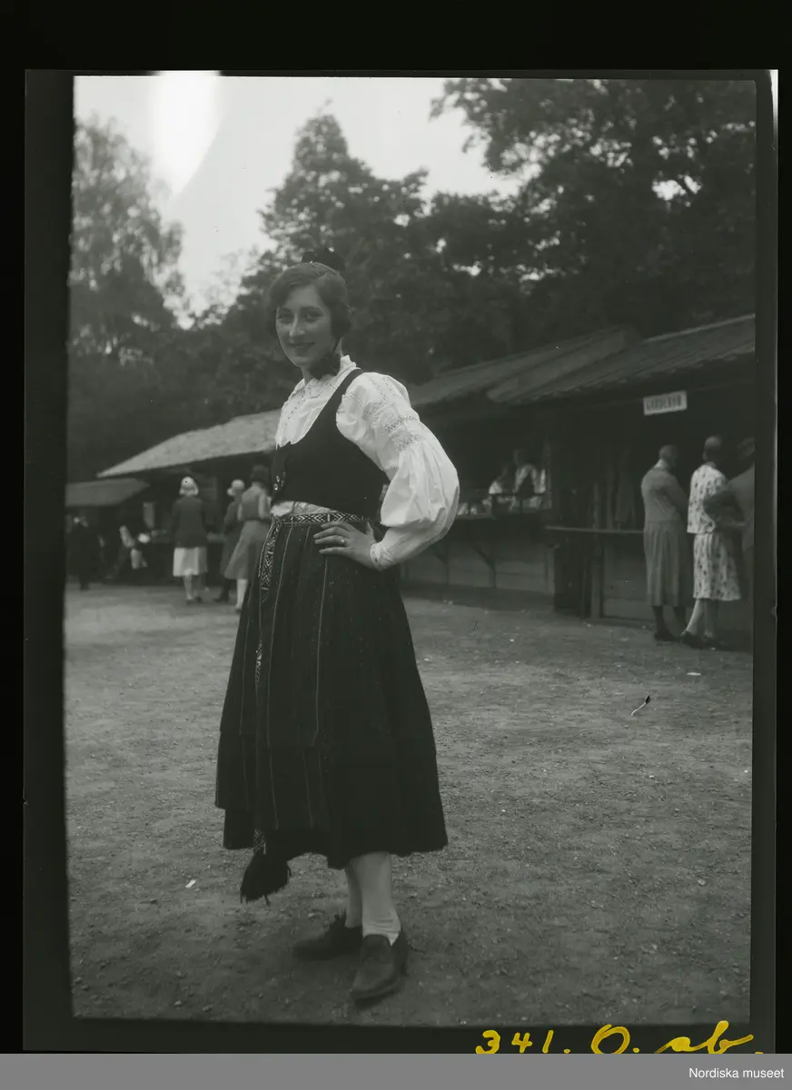 Titel: Porträtt av kvinna i folkdräkt. Skansen, Stockholm.
