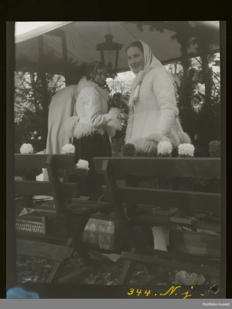 Kvinnor arbetar på julmarknad. Skansen, Stockholm.