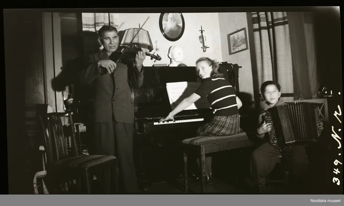 I ett vardagsrum sitter en ung kvinna sitter vid pianot. På var sida om henne står en man spelandes fiol och en pojke spelar dragspel.