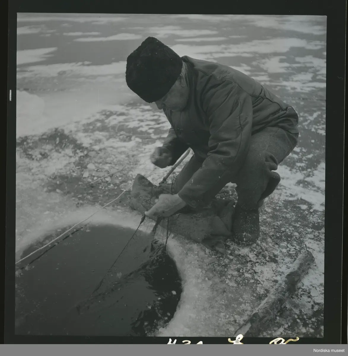 Vinterfiske på sjön. En man lägger nät i ett hål i isen.