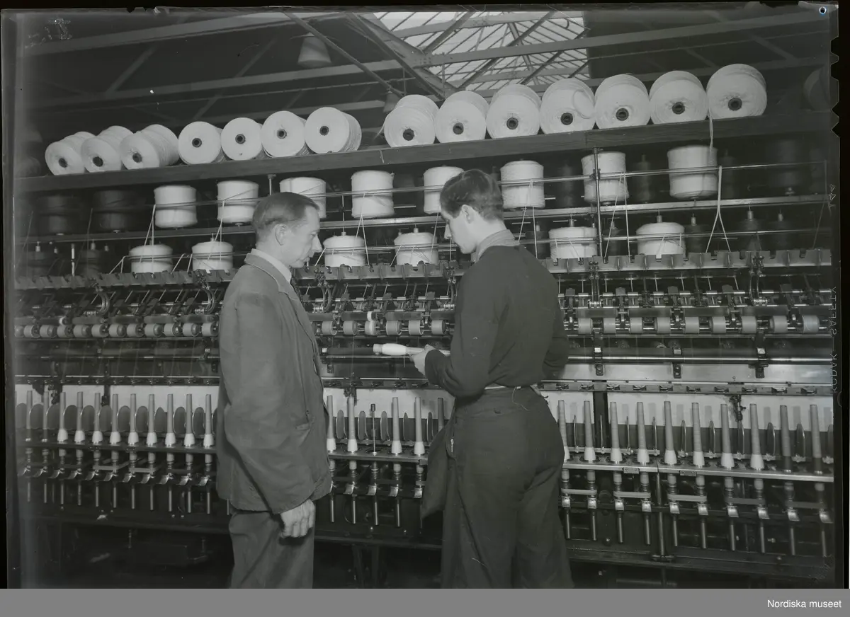 Textilindustri. Två män arbetar vid en vävmaskin. Dokumentation av Slitmanfabriken ABs verksamhet.