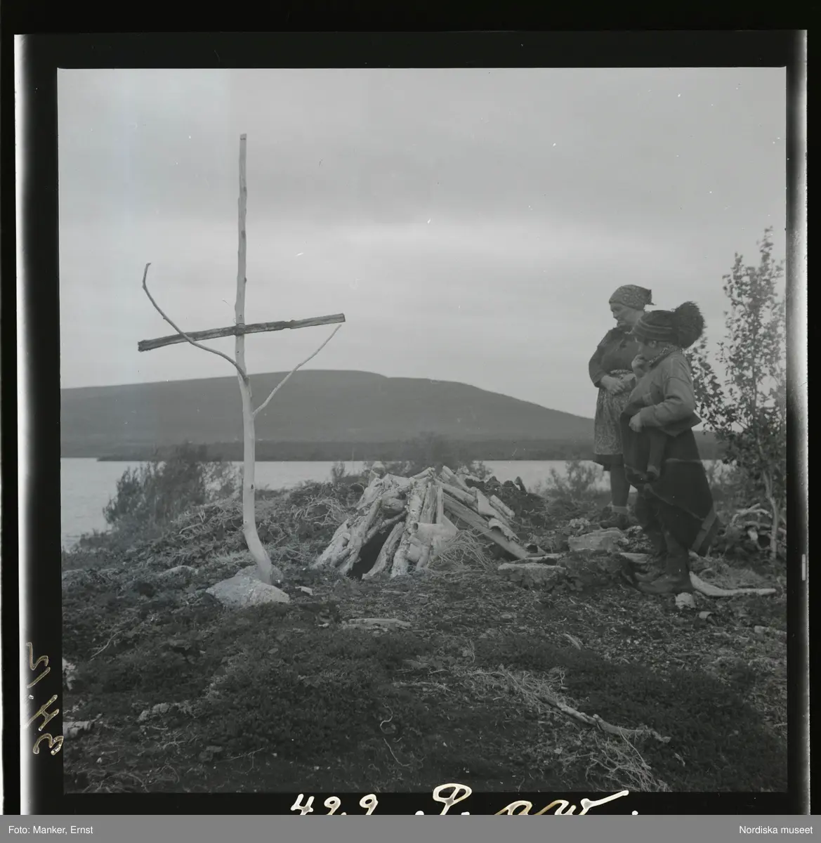 En kvinna och en pojke vid sommargrav med gravkors på Jabmeksuolo vid Vuosko.
