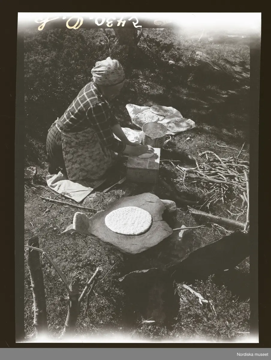 Kvinna bakar tunnbröd utomhus.