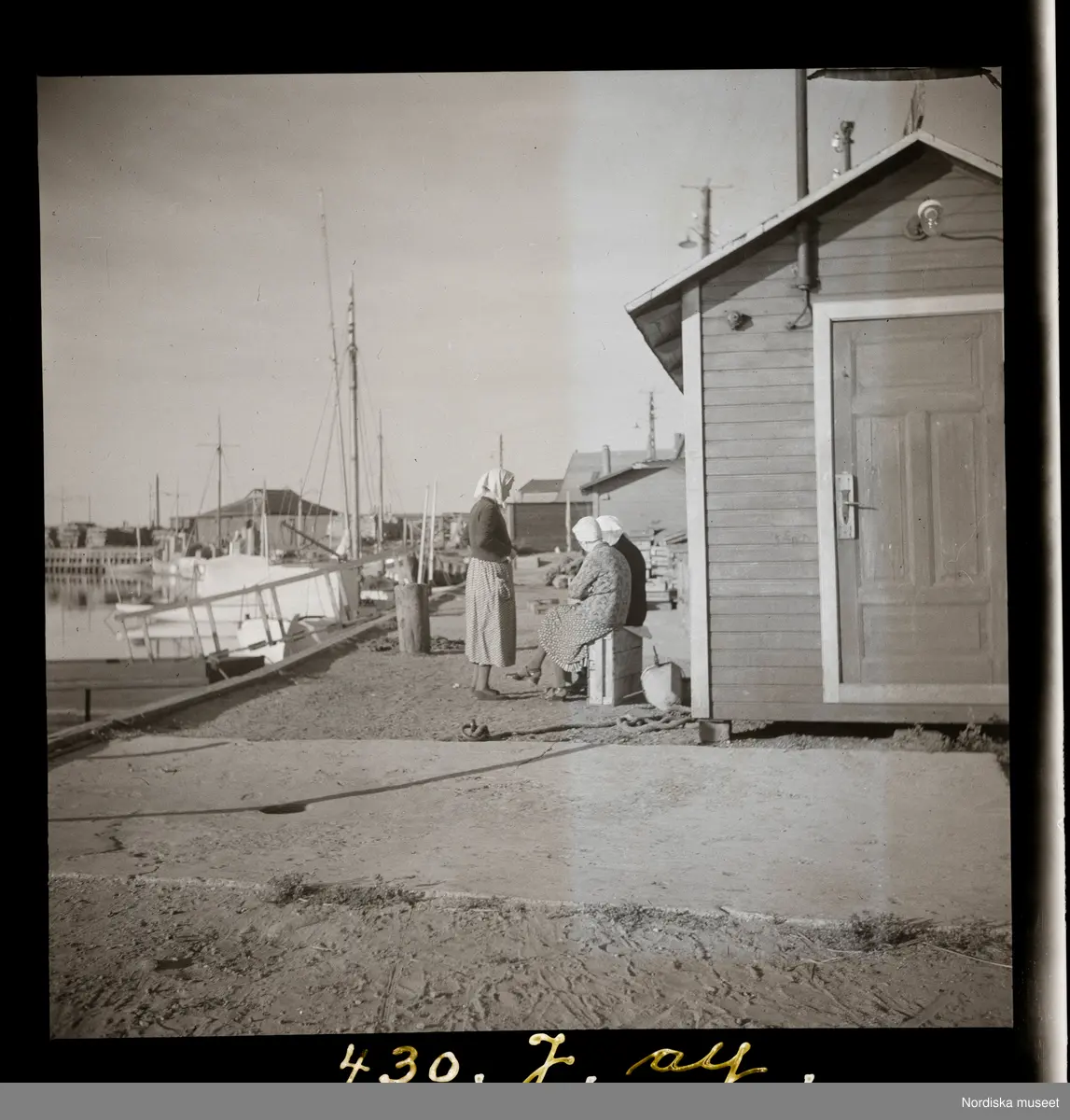Text på montering i arkivet: På kajen halv 7 på morgonen i väntan på fiskebåtarna. Fiskförsäljerskor sittande vid skjulet "Fiskarnas fiskexport".