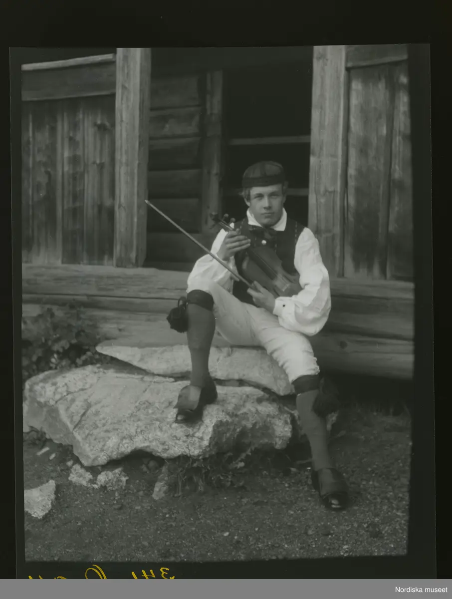 Porträtt av ung man i folkdräkt, sittandes med fiol i famnen. Skansen, Stockholm.