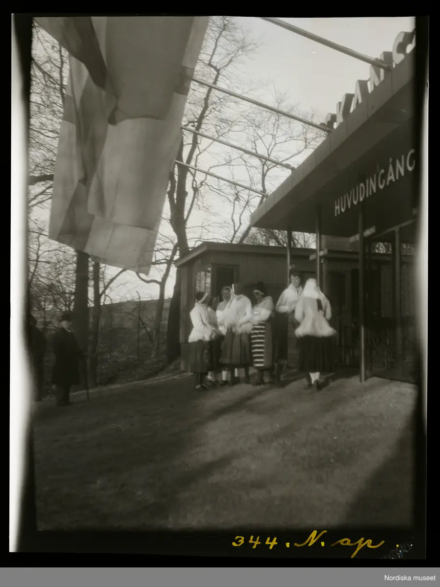 En grupp kvinnor i folkdräkt framför Skansens huvudingång. Skansen, Stockholm.