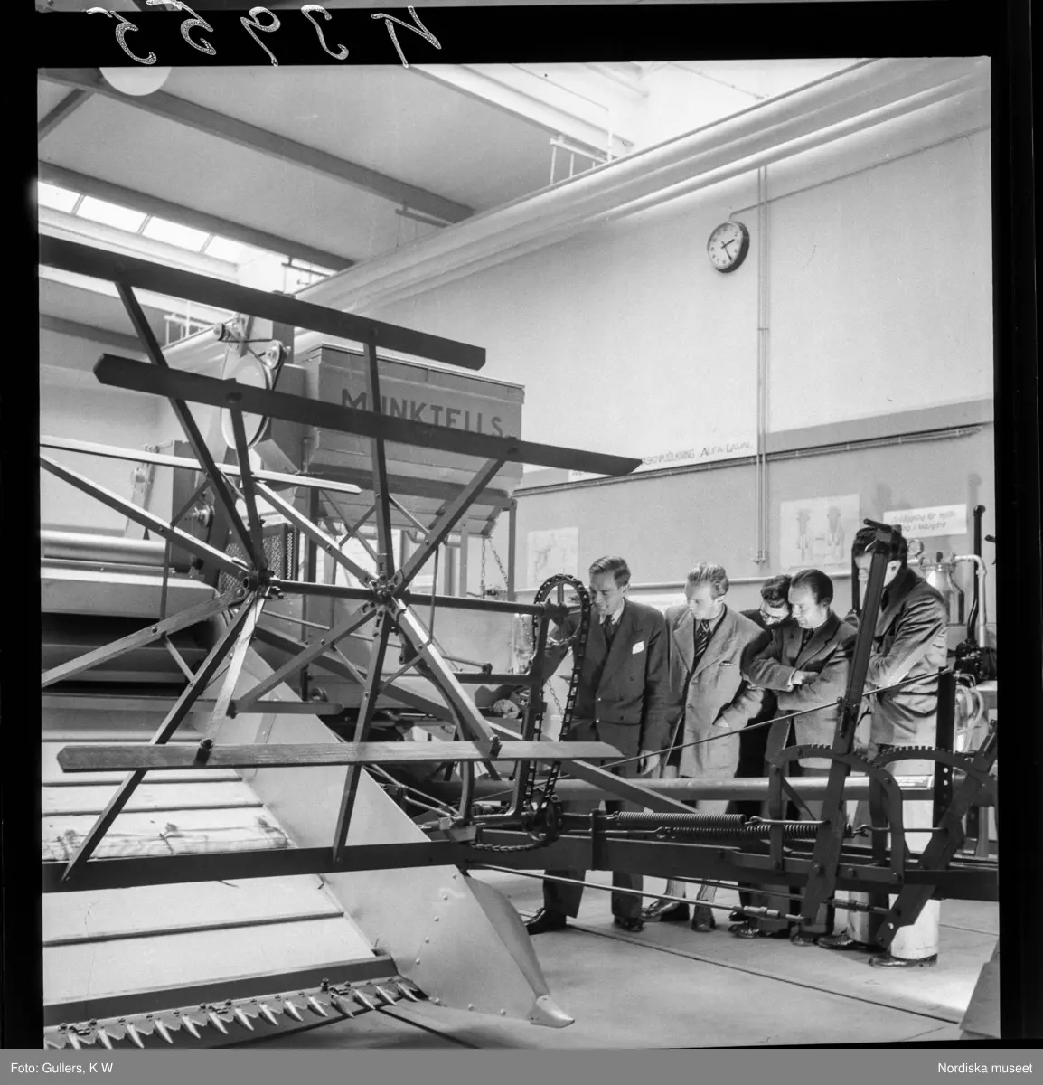 507 D Ultuna. En grupp studenter inspekterar en skördetröska.