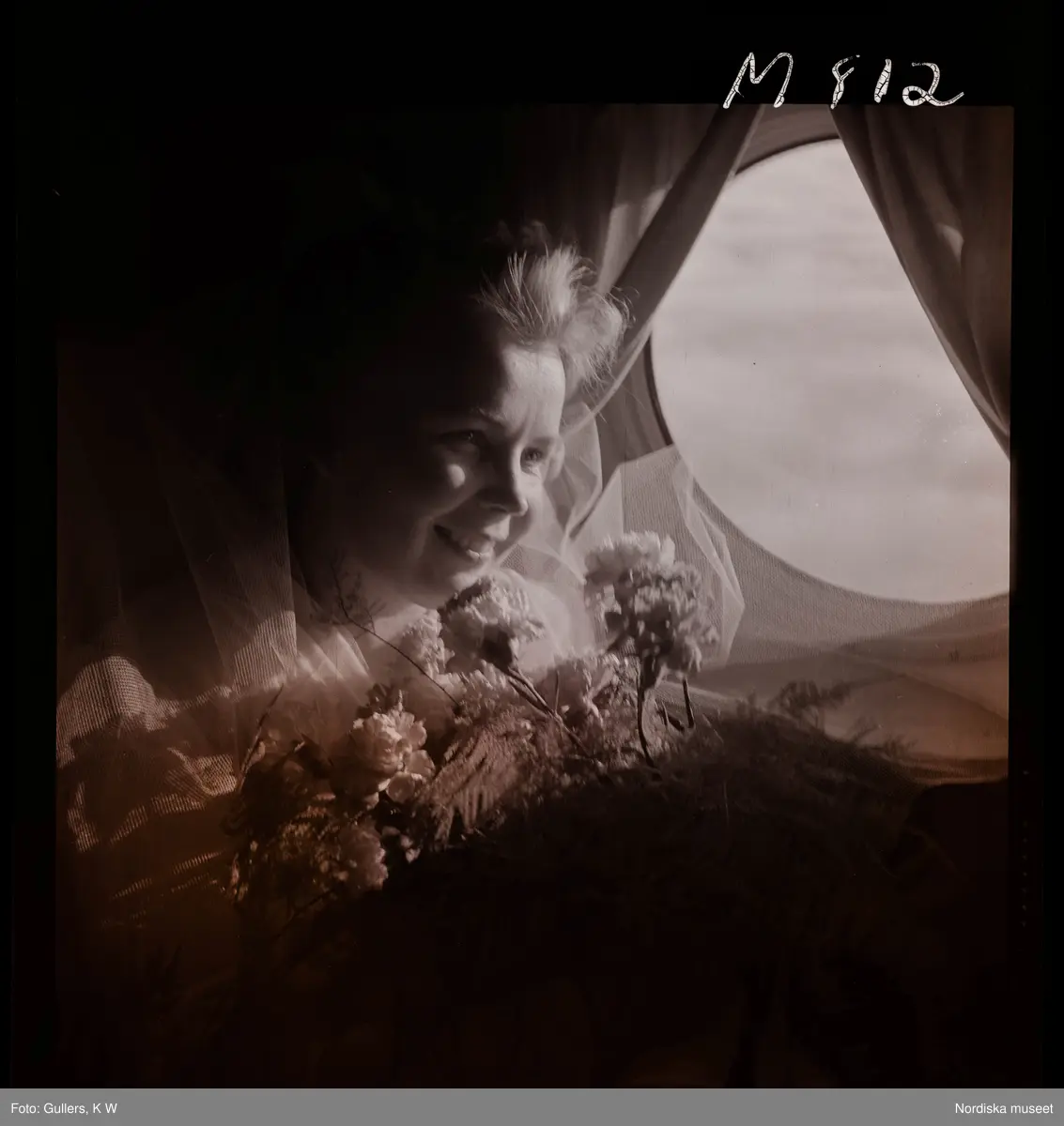 "1680 Bröllop i luften med Abas DC-4 ""Sunnan"" till Paris ". Brud med brudbukett i famnen sitter vid ett flygplansfönster.