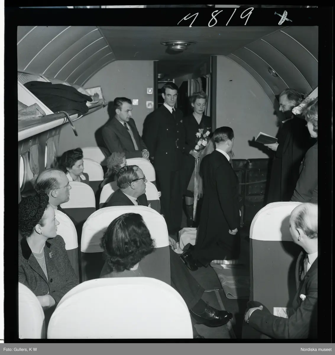 "1680 Bröllop i luften med Abas DC-4 ""Sunnan"" till Paris " Vigsel ombord på ett flygplan. Gäster sitter i flygplansstolarna.