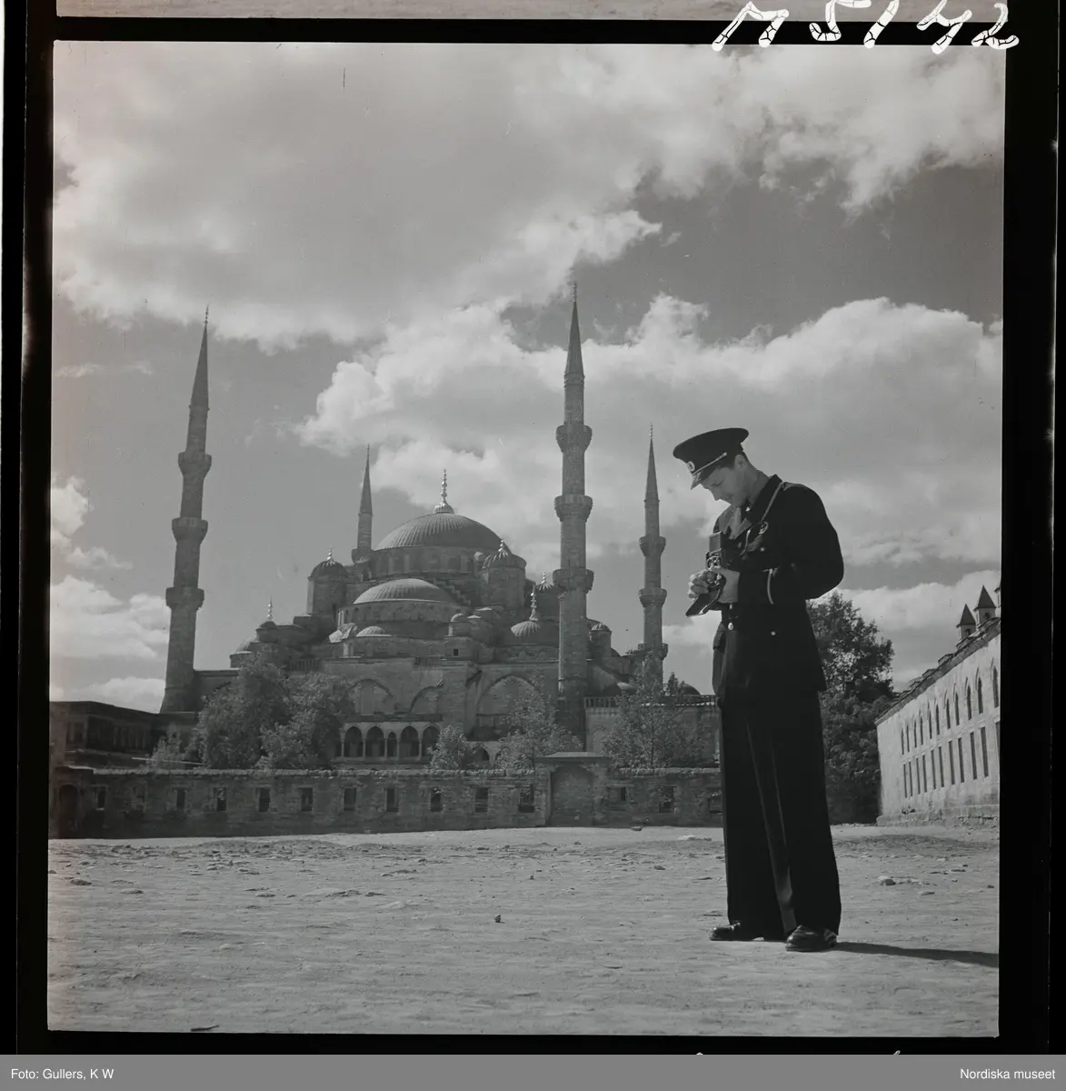 1717/K Istanbul allmänt. En turistande man i uniform står med sin kamera framför Blå moskén/ Sultan Ahmed camii.