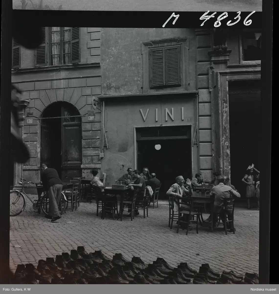 1717/A Rom. Gatuliv. Människor på en uteservering. I förgrunden står en massa skor på trottoaren.