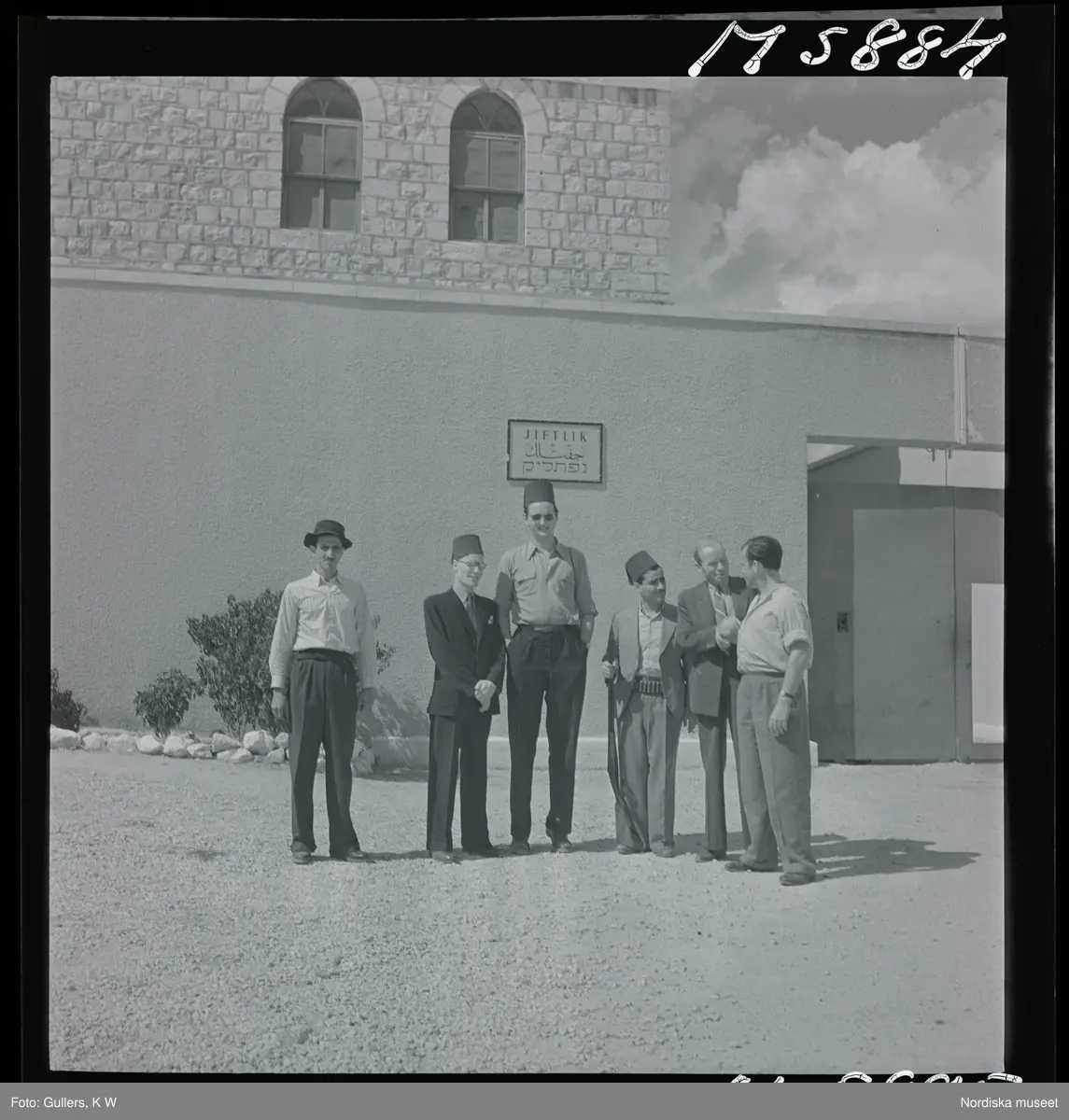 Sex män poserar framför en byggnad. I mitten K W Gullers iklädd fez.