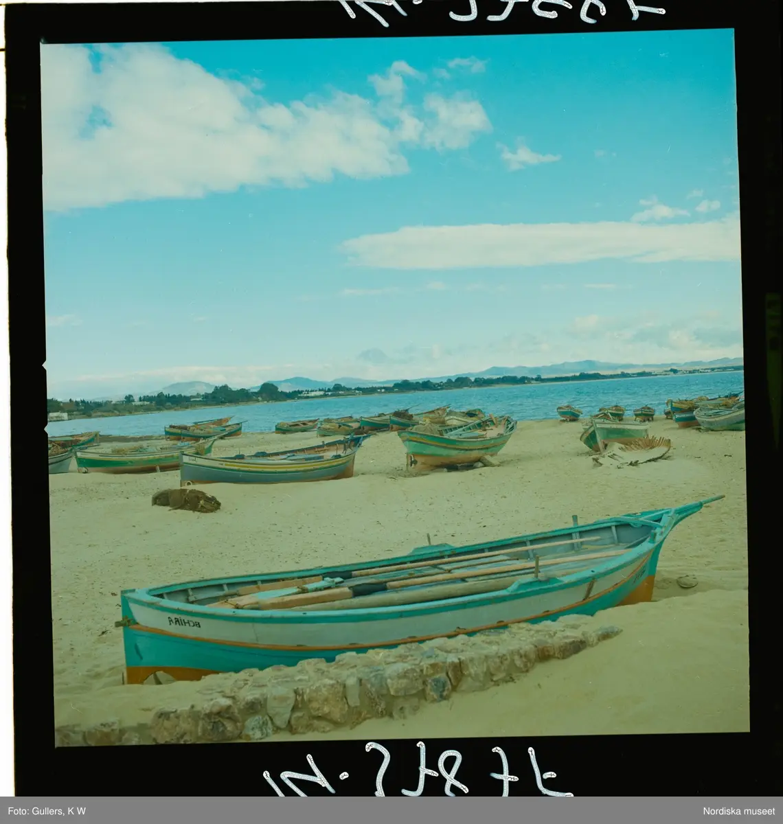 2791 Tunisien Kartago. Traditionellt målade båtar på strand.