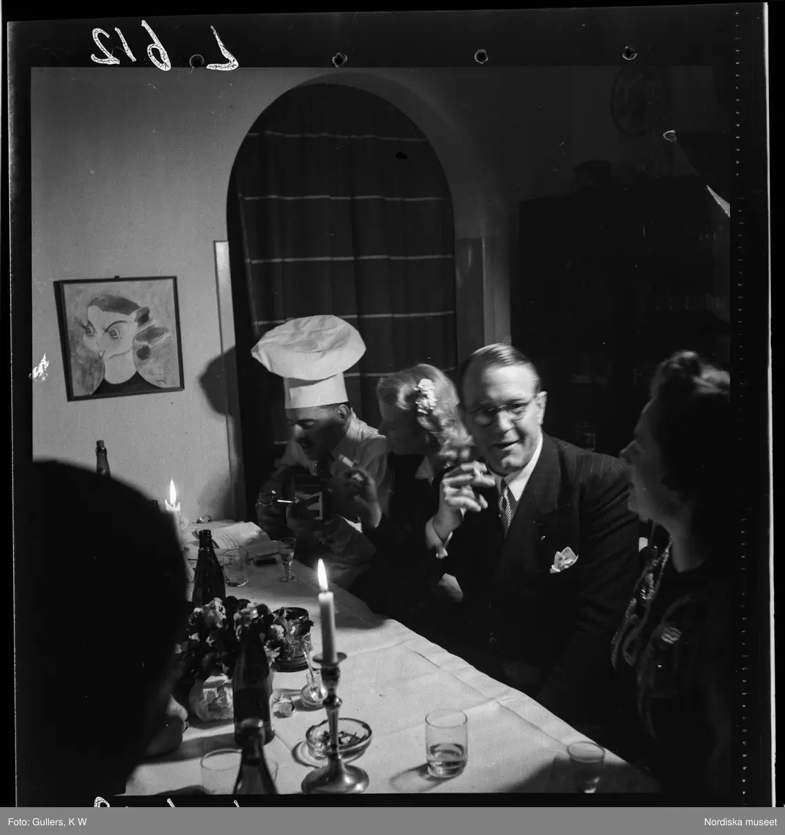 513 C Red. Karlströmer. Festlig stämning kring ett matbord. Ett sällskap roar sig.