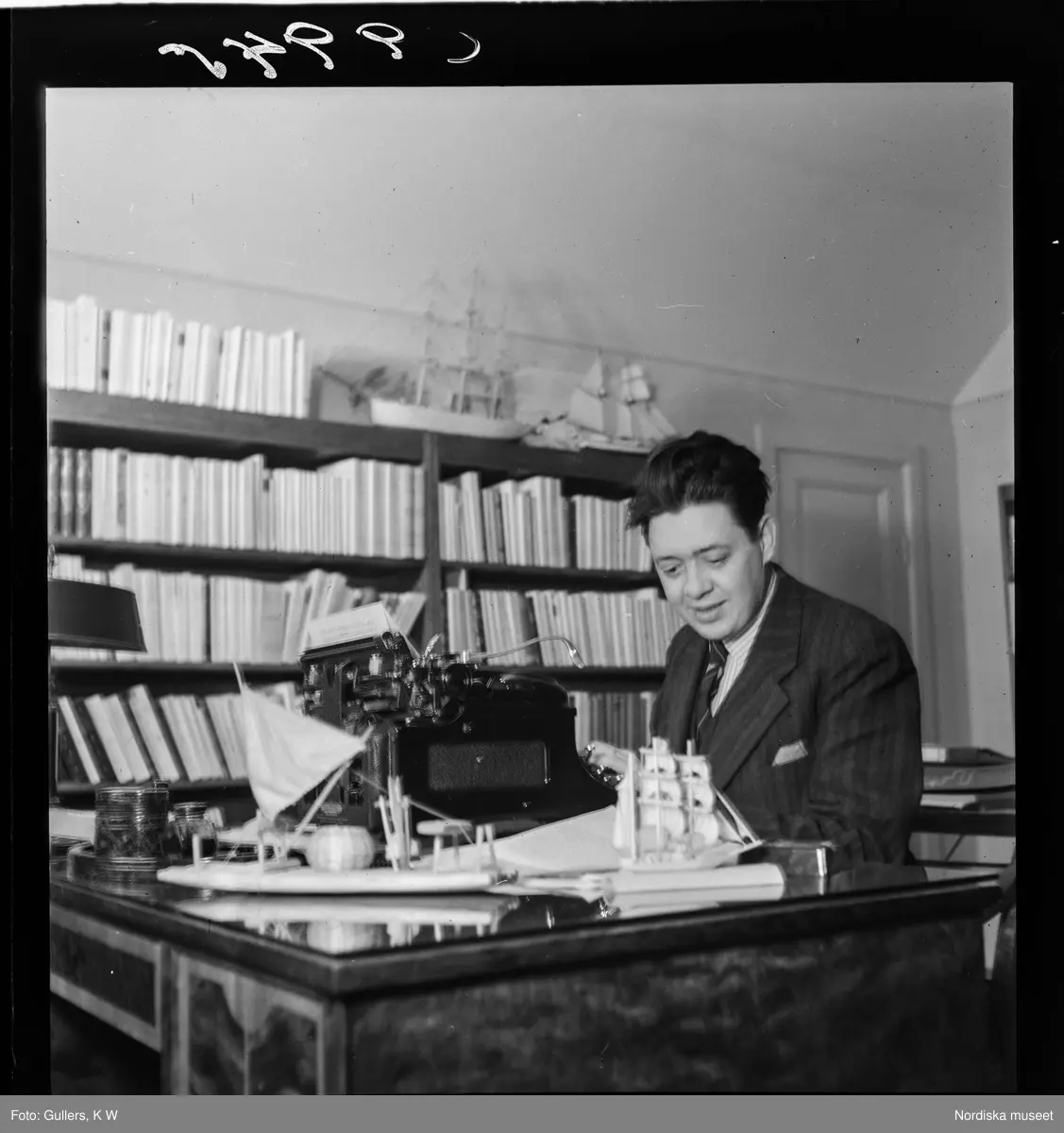 509 Hammenhög v för Allers. En man sittandes vid skrivmaskin. På bokhyllan bakom honom står modellfartyg.
