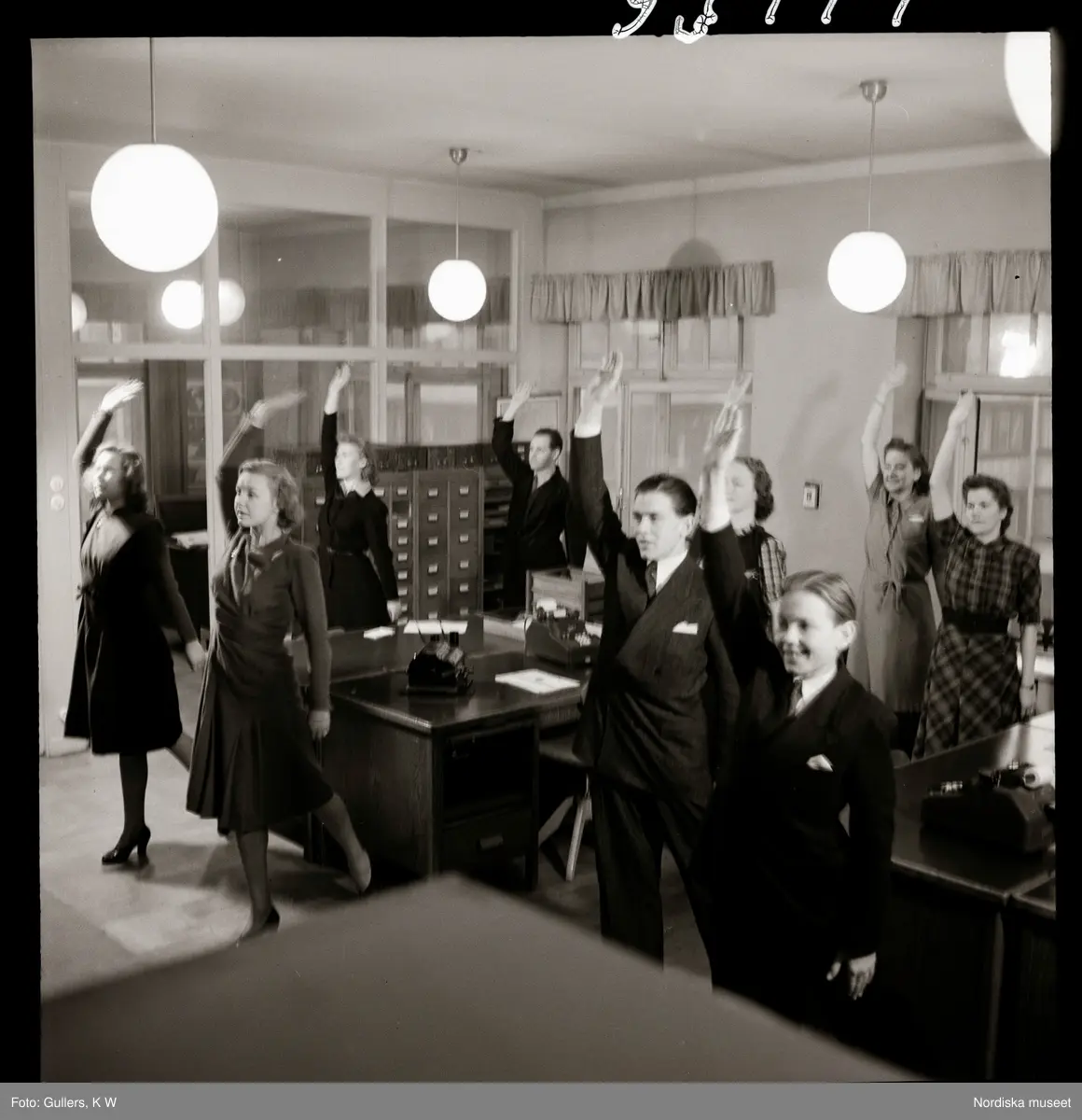 588 G, Åtvidabergs Industrier kontorsgymnastik. En grupp anställda gymnastiserar på ett kontor.