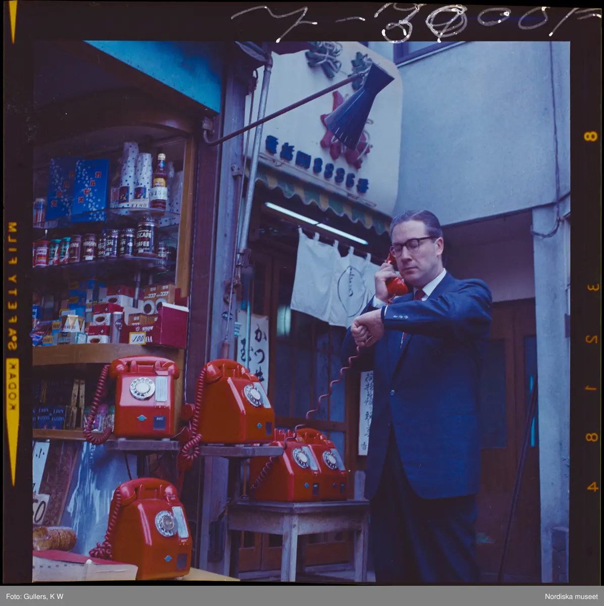 585/8 Facit Tokyo Daberg. En man telefonerar vid en station med flera röda telefonapparater.