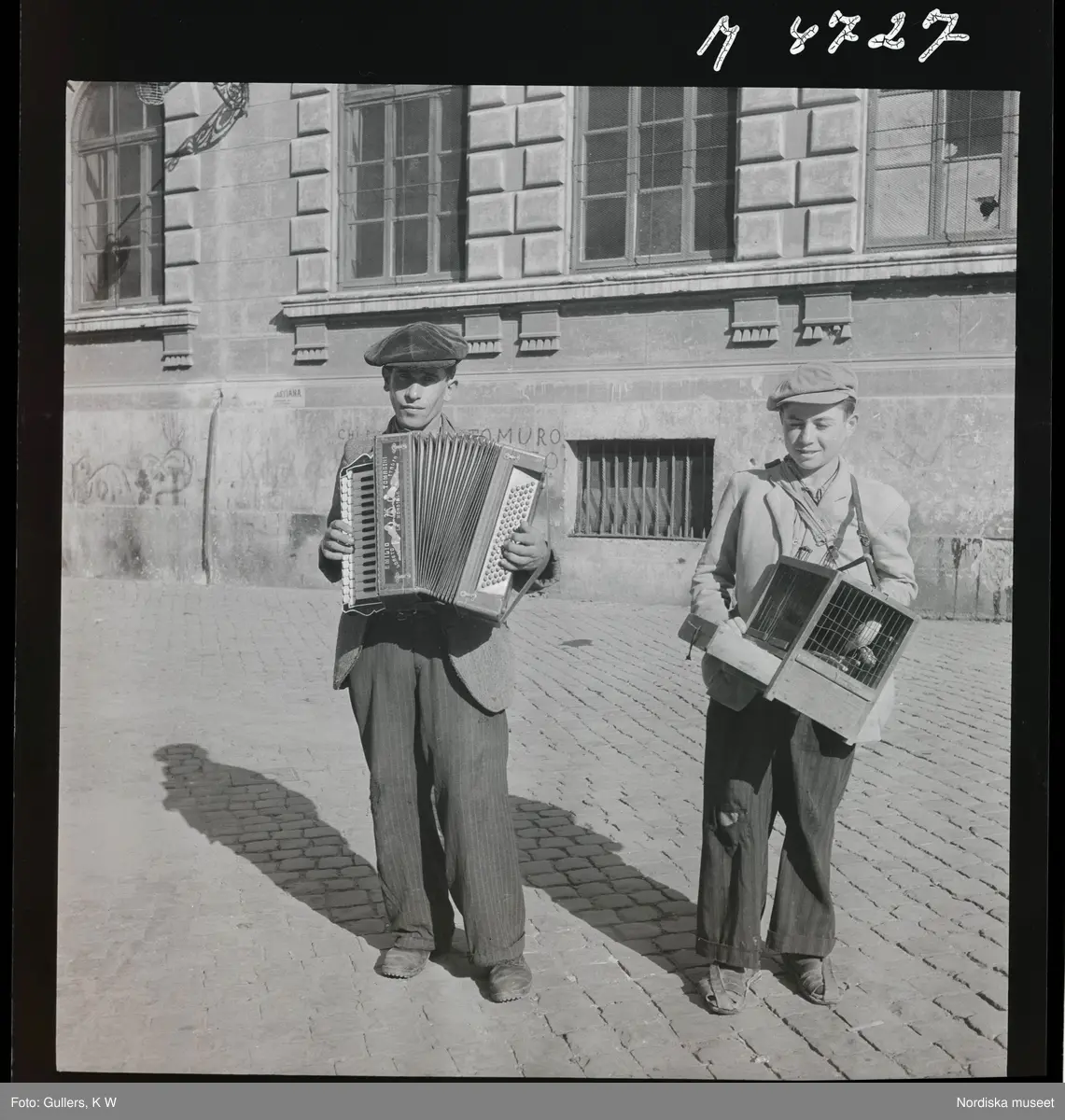 1717/A Rom. Gatuliv. En gatumusikant med dragspel och en pojke med en fågel i bur.