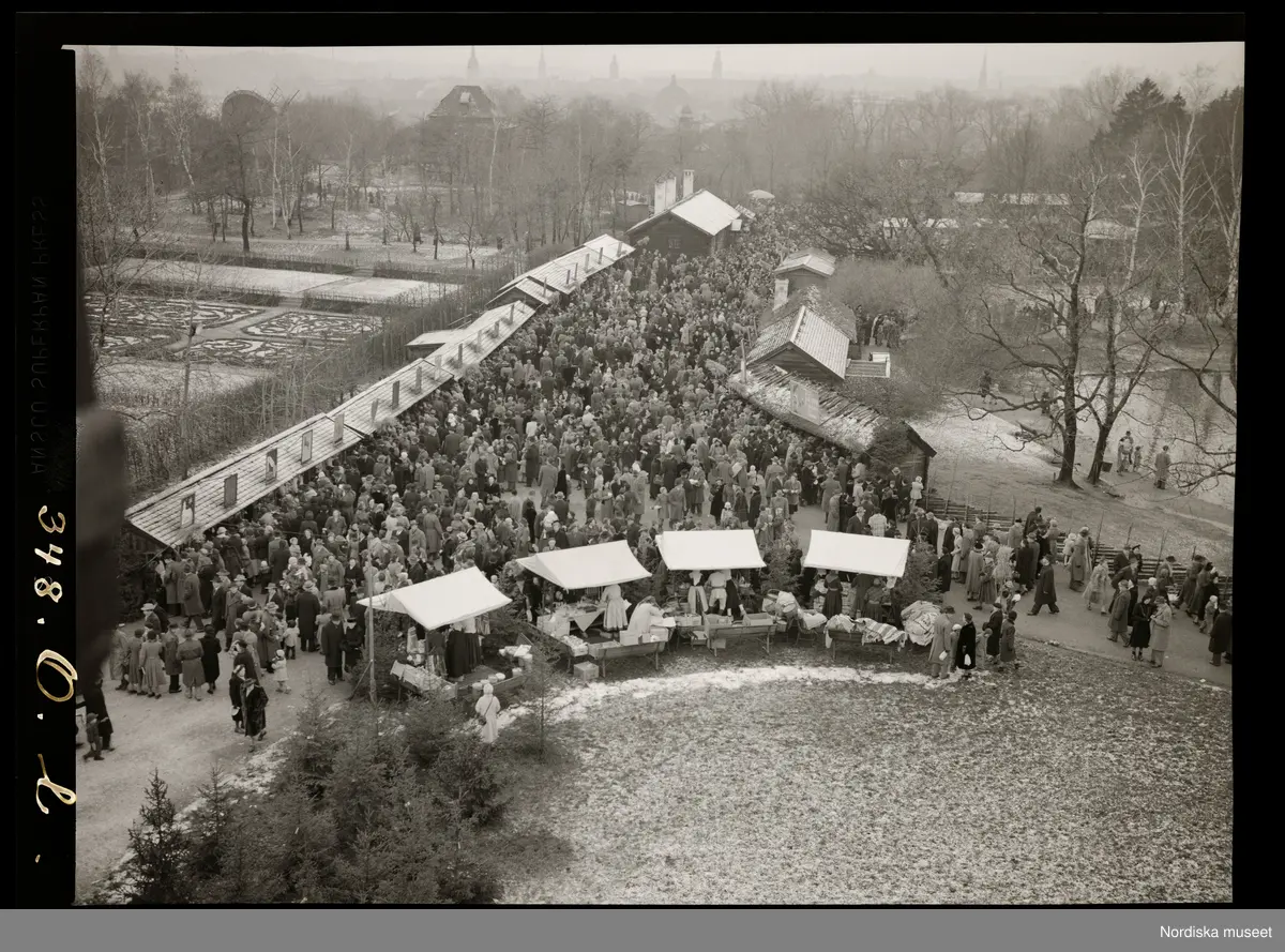 Vy över Skansens marknadsgata full av besökare, Stockholm.