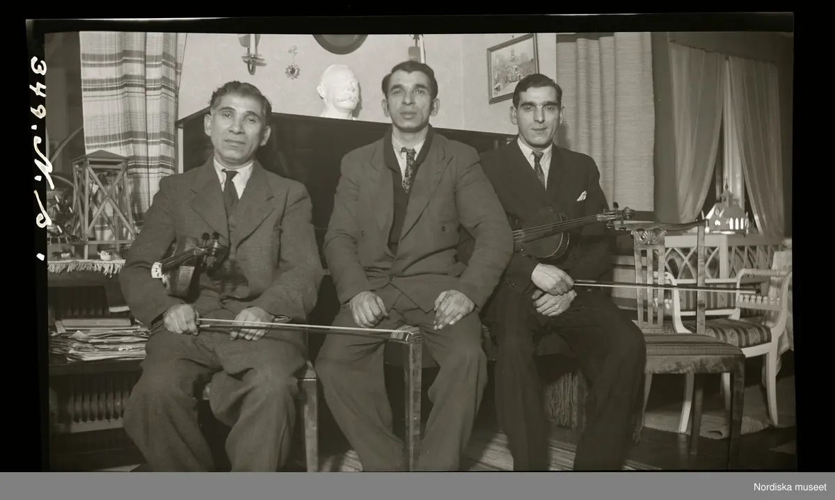 Porträtt av tre män sittandes framför pianot i ett vardagsrum. Två av dem håller varsin fiol.