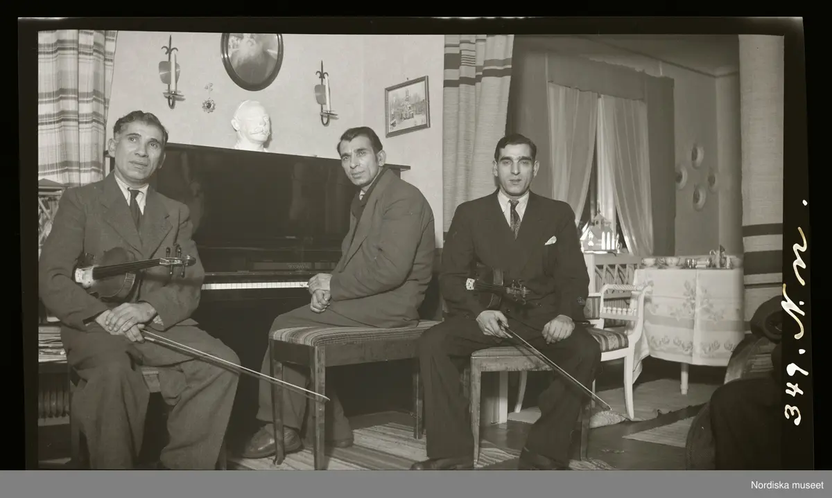 Tre män. En sitter vid pianot, de andra håller varsinn fiol.
