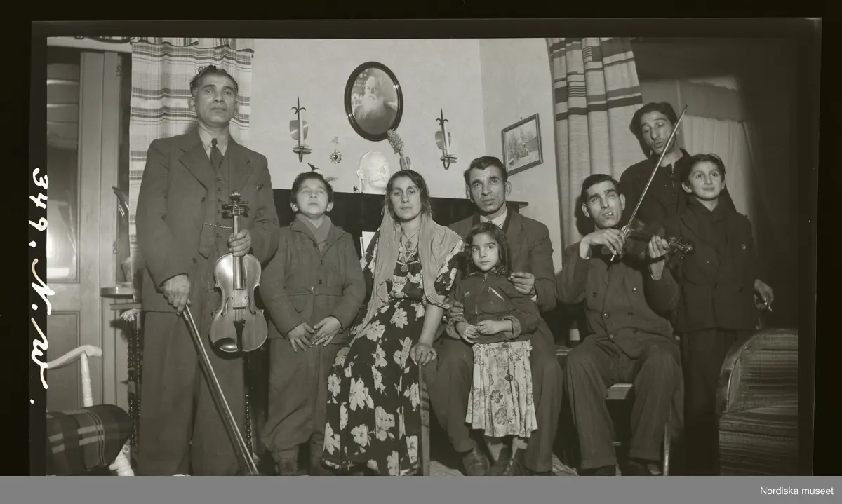 Porträtt av en grupp män, en kvinna och barn i ett vardagsrum.