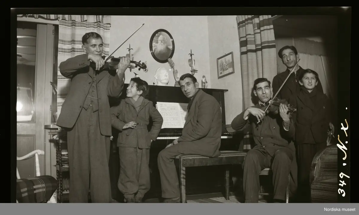En grupp män och två pojkar musicerar i ett vardagsrum.