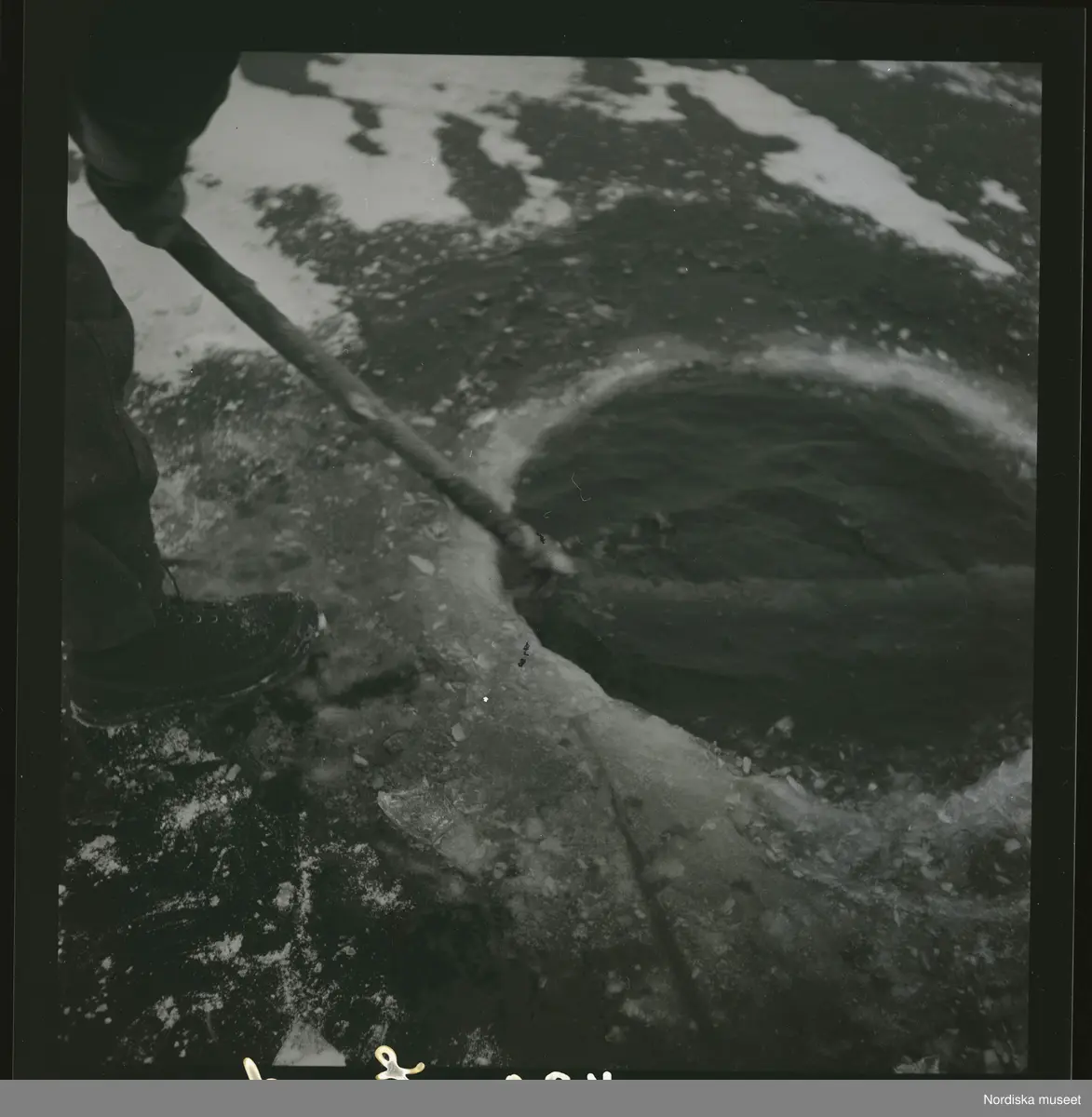 Vinterfiske på sjön. Det fiskas genom hål i isen.
