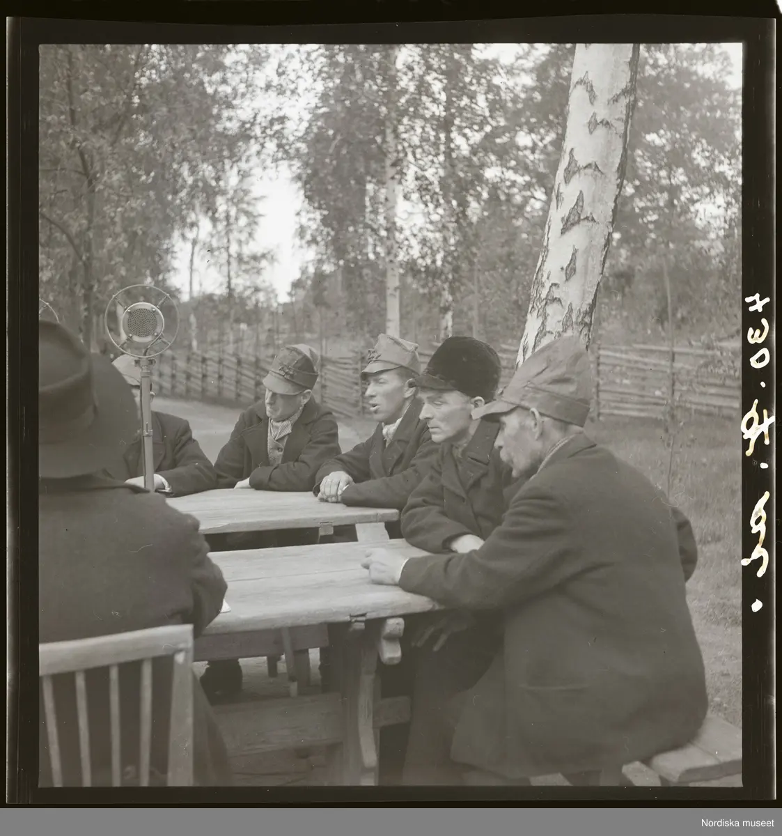 En grupp män sitter kring ett par bord uppställda utomhus på Skansen, Stockholm. Mellan dem står mikrofoner uppställda och en av männen har anteckningar framför sig. Möjligen radioupptagning/inspelning.