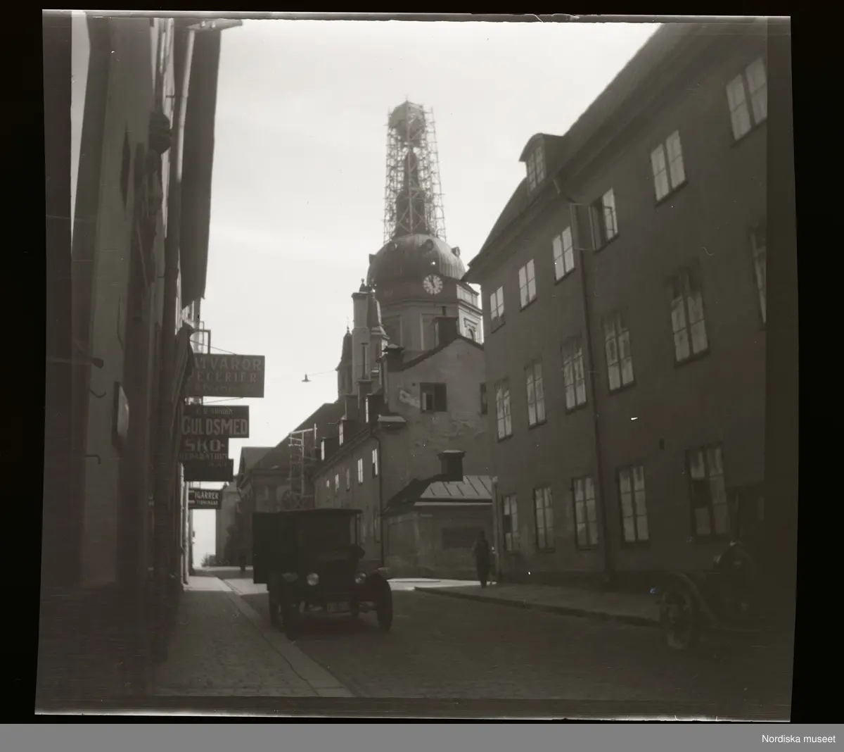 Högbergsgatan. Katarina kyrka med byggnadsställningar kring tornet. Södermalm, Stockholm.