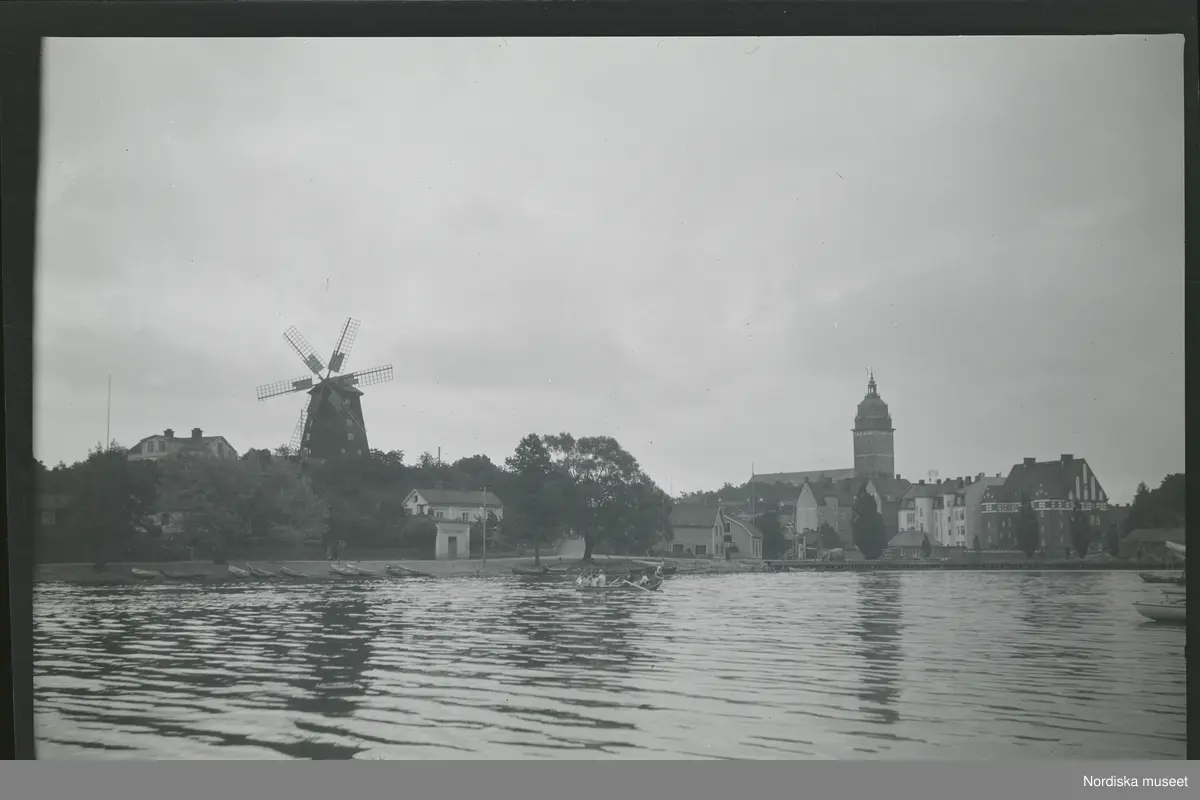 Vy över Strängnäs med väderkvarnen och domkyrkan.