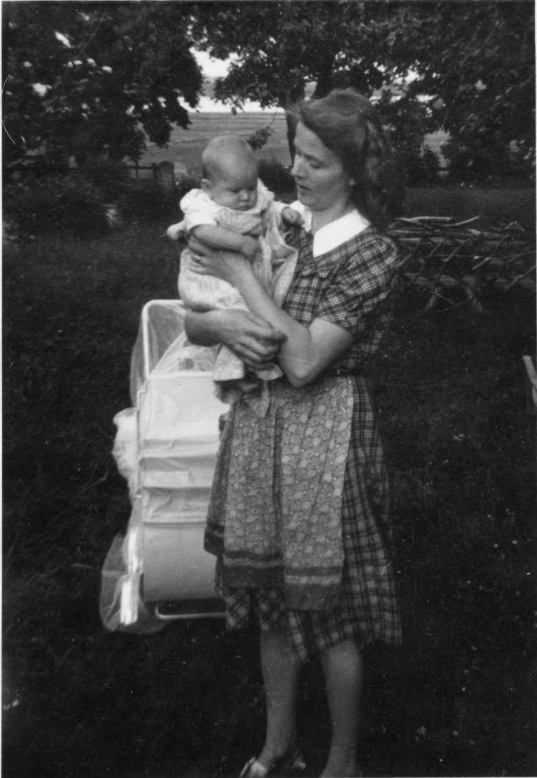En kvinna i rutig klänning och förkläde står med ett spädbarn i famnen, en barnvagn står bakom dem.