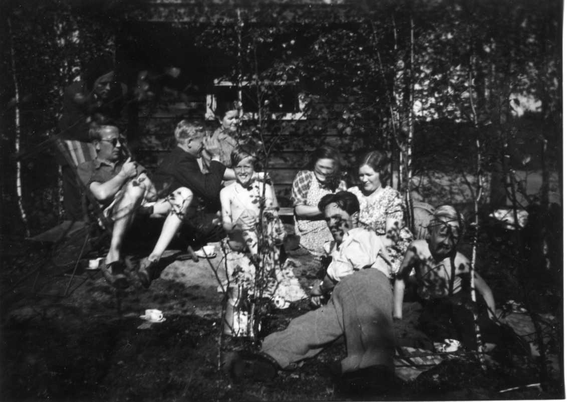 Ett sällskap sitter avslappnade på marken vid en stuga.