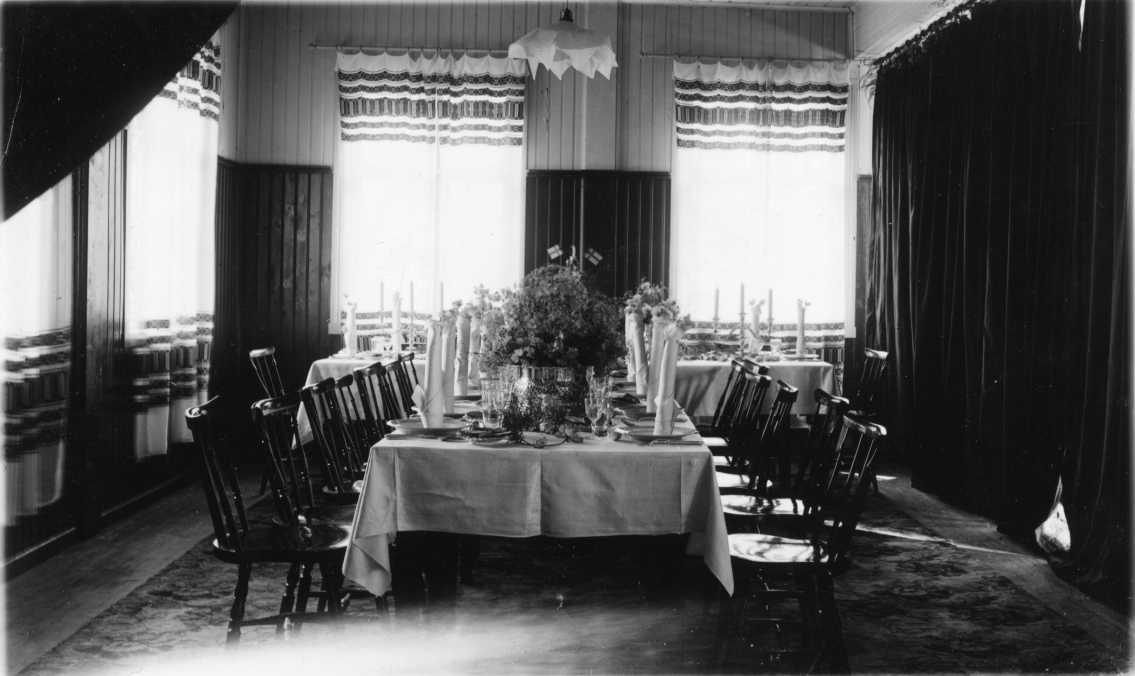 Ett bord dukat till fest med vit duk, blommor och vikta servetter.