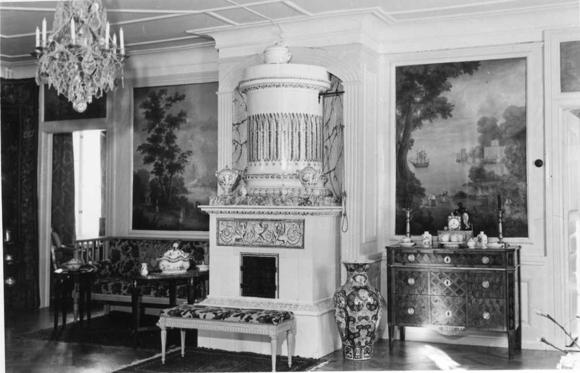 Interiör från så kallade Borgmästargården i Gränna. Målade väggfält på ömse sidor om en dekorerad kakelugn.