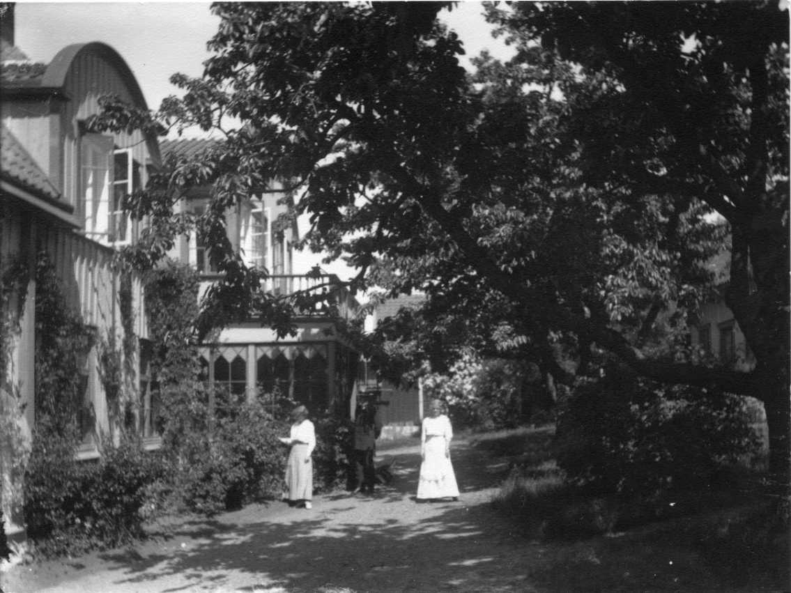 Två kvinnor och en man i trädgården till så kallade Borgmästargården i Gränna.