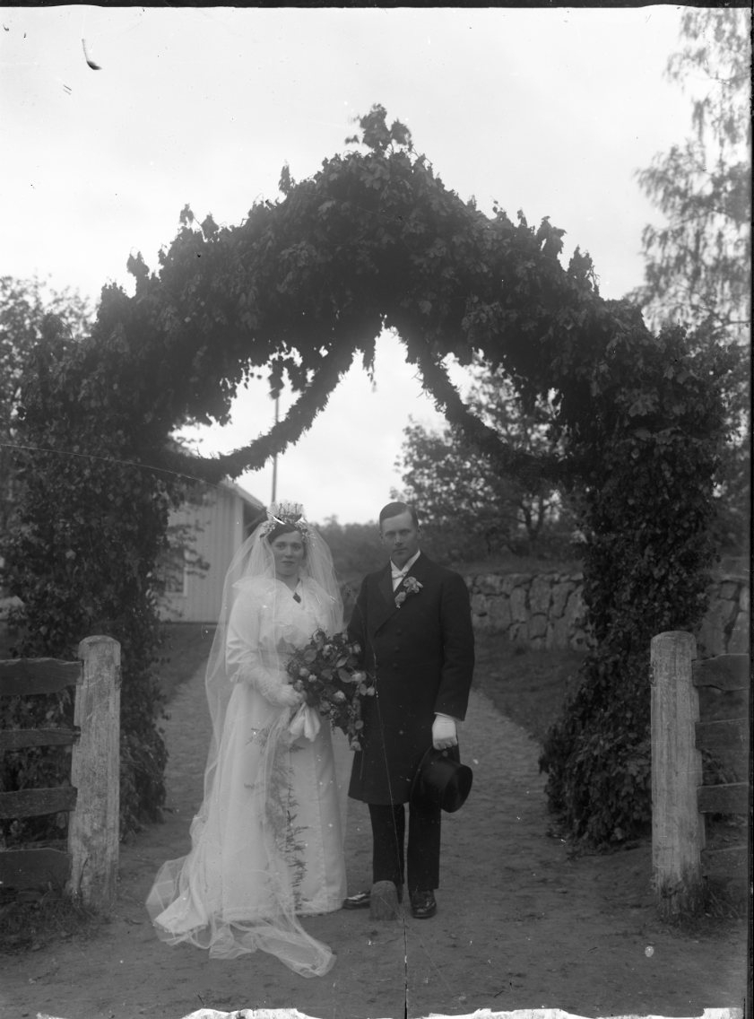 Ett brudpar - bruden i vitt - stående under blomsterbåge vid infarten till en tomt.