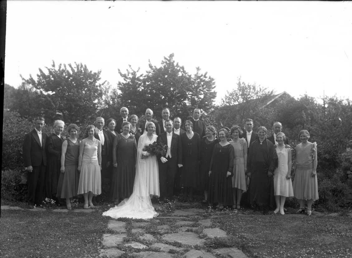 Ett brudpar - bruden i vitt - med stort sällskap stående i en trädgård.