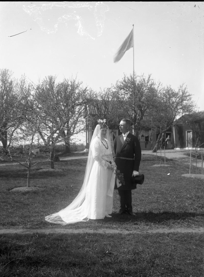 Ett brudpar - bruden i vitt - med stående i en trädgård. Ett tvåvåningshus och uthuslänga i bakgrunden.