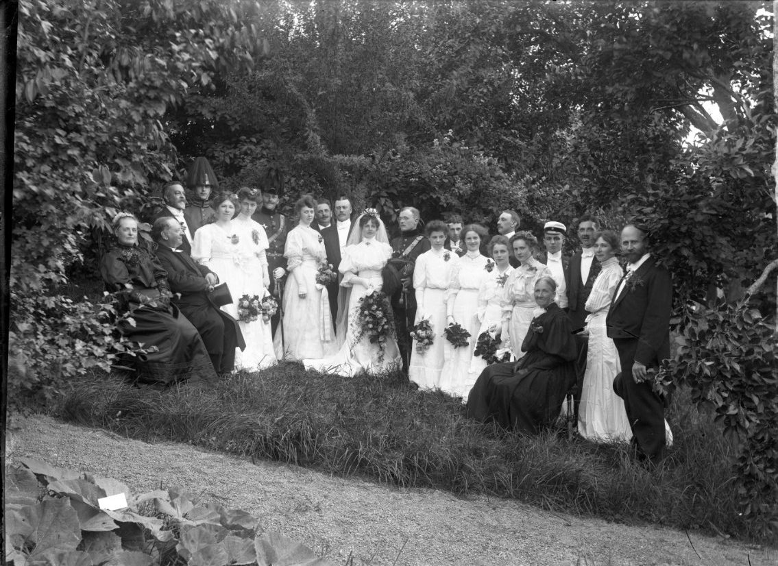 Ett brudpar - bruden i vitt - med ett sällskap i en trädgård. Brudgummen i militär uniform.