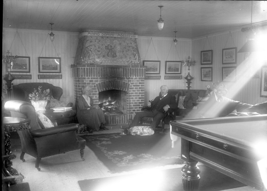 Ett äldre par sitter vid en öppen eldstad, murad med tegelsten. Dekorerad överdel med bland annat vapensköld och texten "Anno Domini MDCCCCVIII". Troligen ett biljardbord till höger. En kraftig solstråle från höger som lyser på golvet.