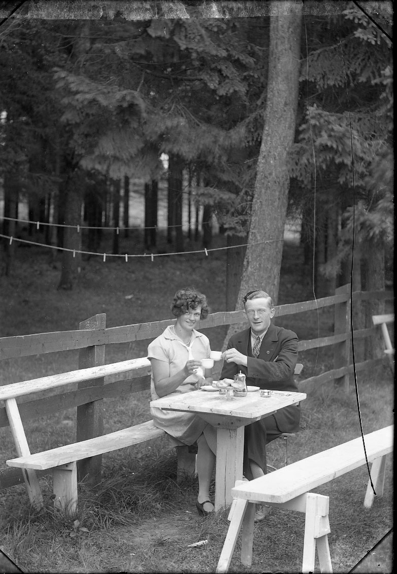 En kvinna och en man sitter vid en bänk med bord utomhus och dricker kaffe.